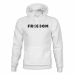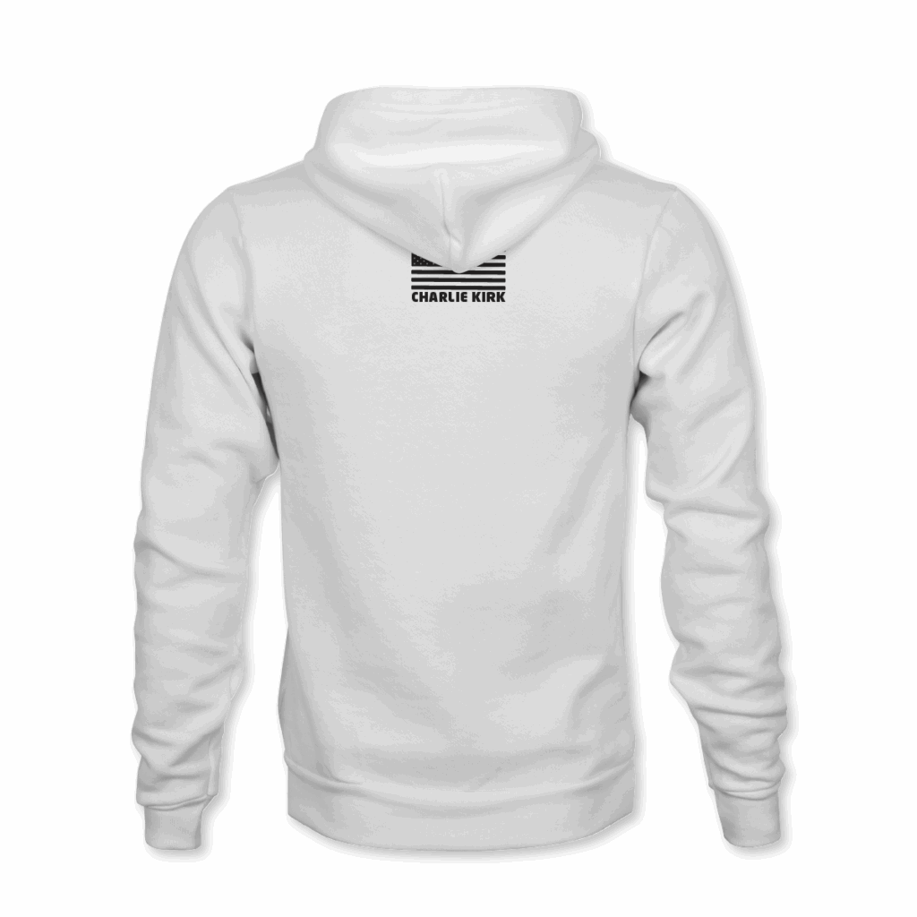 Classic white 10oz hoodie featuring bold black “FREEDOM” lettering on the front and a minimalist American flag with “Charlie Kirk” printed on the back.